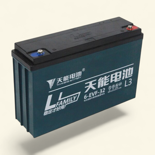 Here is the latest generation lead-acid gel battery from Tianneng. It has a power output of 12 volts and a capacity of 32 amps.