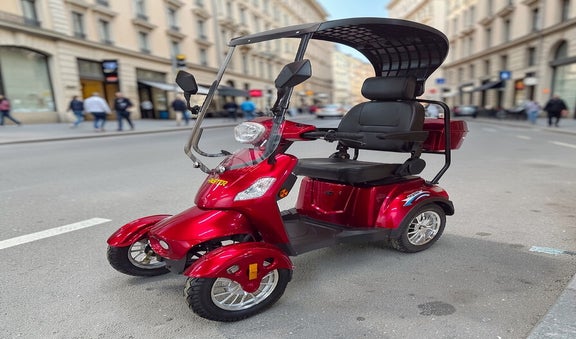 Check out our Faster Q1 XL electric mobility scooter. It has virtually the same features as our Faster Q1, but as a bonus, it comes with a windshield and a roof!